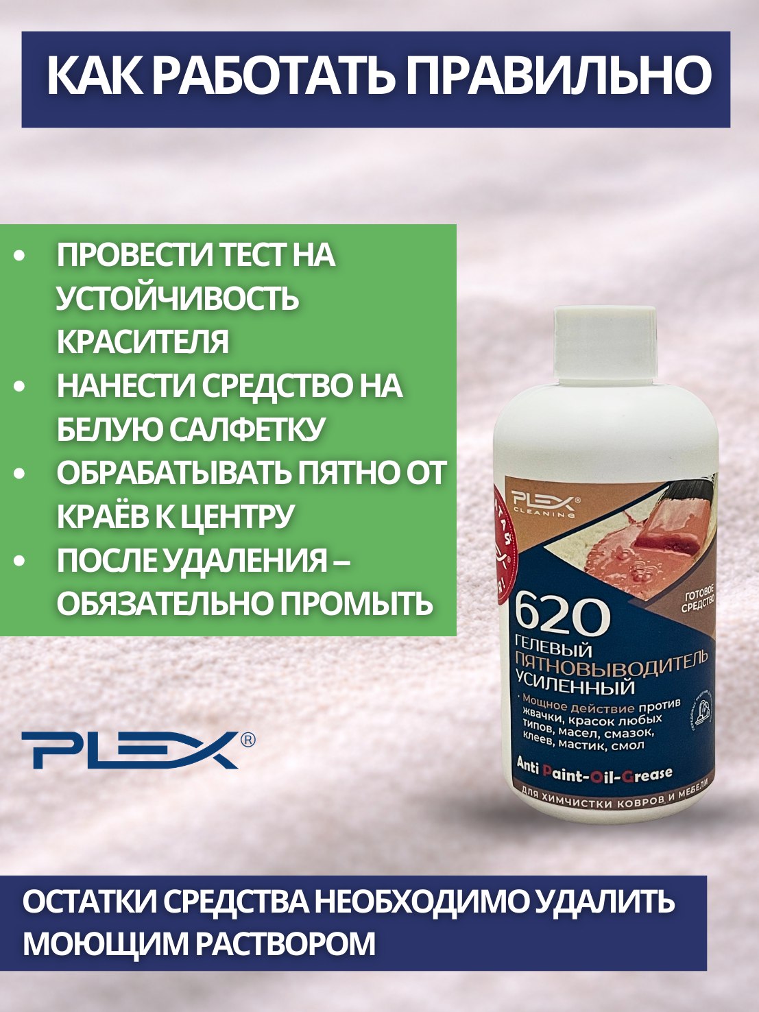 ПРИМЕНЕНИЕ: Проведите предварительный тест на устойчивость красителя. Средство готово к использованию. Нанесите пятновыводитель на чистый белый кусок ткани и удалите пятно от краев к центру. Обязательно удалите остатки пятновыводителя с поверхности путем очистки моющим средством. Дайте поверхности высохнуть.